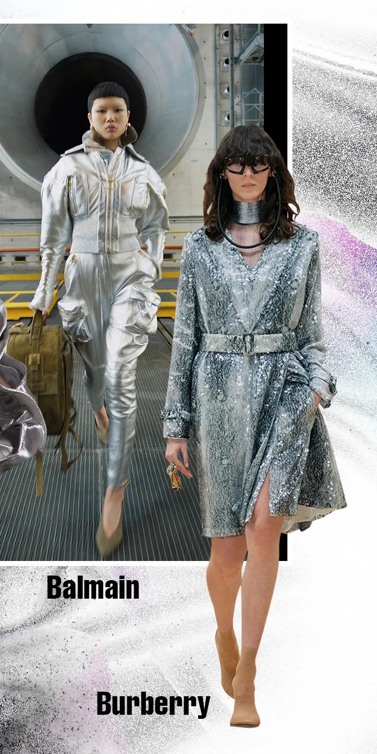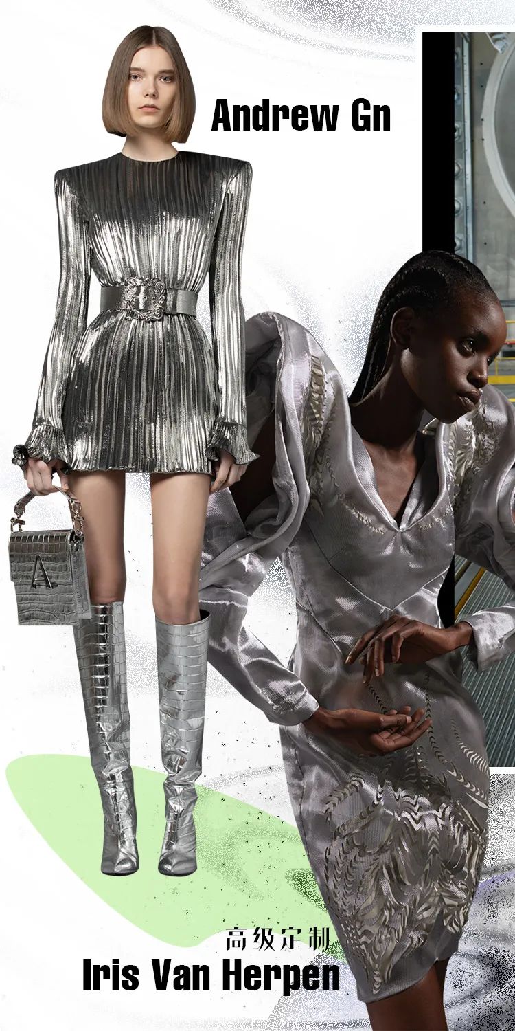 太空元素「絕佳代言」的銀色,在Balmain、Andrew Gn、Iris Van Herpen等不同品牌的演繹下,呈現出亦剛亦柔的多變特質,滿足了人類對於未知世界的一切想像。