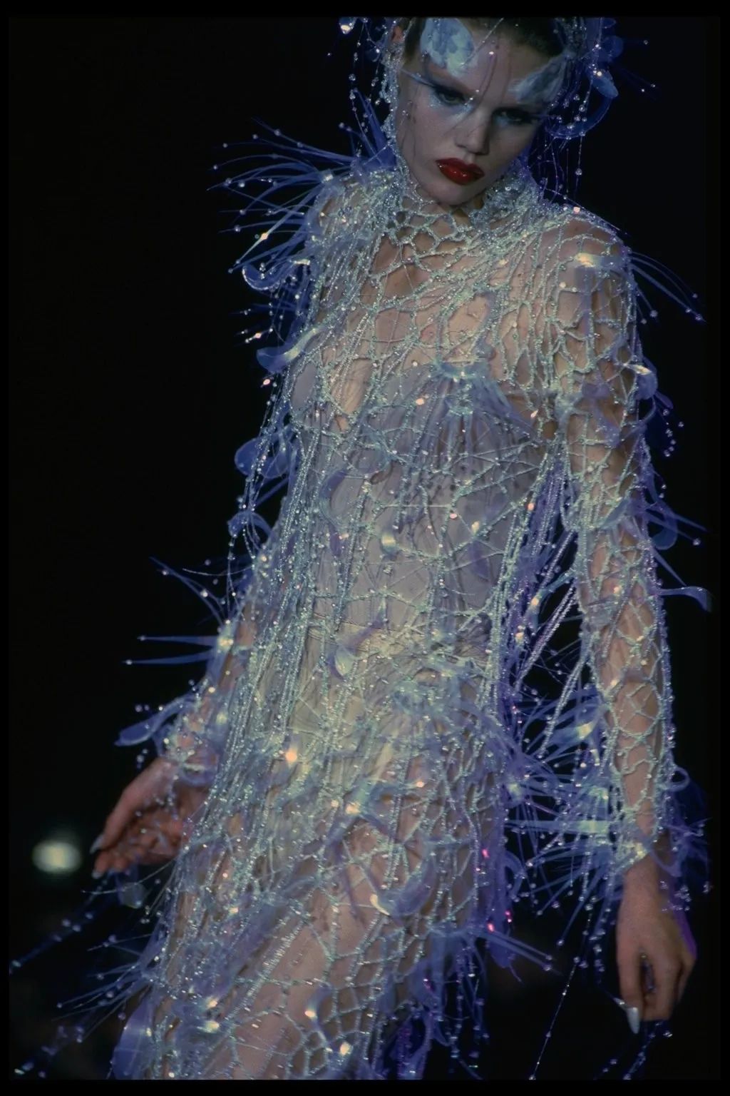 1979秋冬系列中,模特從頭到腳「銀裝素裹」:用銀色塗層面料打造的連體衣上,肩部廓形被加強,如飛簷般兩角翹起;領部、袖口、兜線的剪裁同樣乾淨利落;相同材質的腰帶勾勒出曼妙的腰線,也令衣服更加服帖,如第二層肌膚般與身體共生共存。其他造型中,金屬面料被融入了打褶、扭結等細節設計,突破了人們心中太空服硬挺且一馬平川的單一印象。到了80年代,Mugler的演繹更加華麗。切割出各種鏤空細節的金屬胸衣、用特殊材質打造的波光粼粼的羽毛連體衣、仿佛女神降臨般點綴著浪漫星系的透明紗袍接連驚艷登場。Mugler塑造了一個又一個美艷不可方物的女性形象,他擷取太空與未來蘊含的無限可能,進而將其註入拓寬美的維度的歷程當中。並不是所有人都對未知心懷樂觀,Alexander McQueen為Givenchy打造1999秋冬系列時,情緒的切入口便是一種對於未來好奇與恐懼並存的龐雜態度。從肅穆的色調、強勢的廓形與抽象的印花中,不難感知這種防禦心理。整場秀的最後幾個造型中,錯綜龐雜的電路甚至化身衣上密密麻麻的圖案,還沒等觀者解開這道謎題,閉秀的模特便在黑暗中橫空出場:身上纏繞著的LED燈管此起彼伏地閃爍著刺眼的色彩,仿佛功能突然雜亂的機器,在一片混沌中叫囂著,然後沒有征兆地戛然而止。McQueen將自己一貫的敏感與脆弱投射進時裝中,這也賦予了太空主義更加完整的意義:有人心向光亮,充滿希冀;自然有人留戀黑暗,寧居深淵,因為漆黑中能映照出最璀璨的星光。
