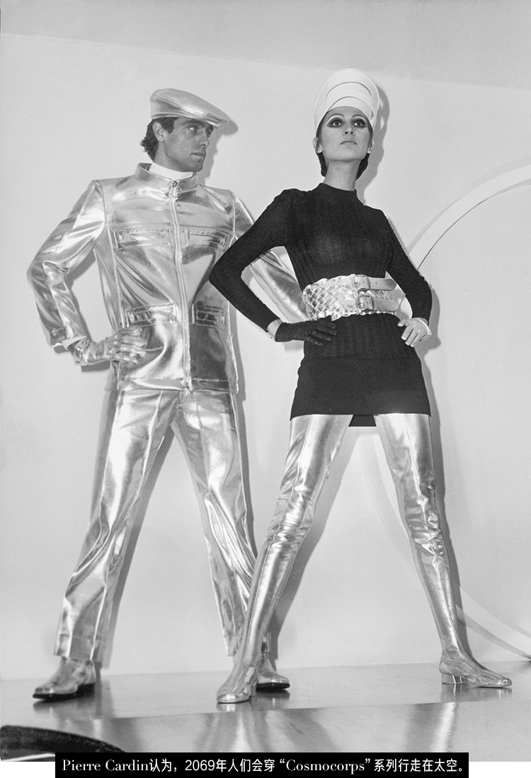 如果說André Courrèges是勇往直前的未來主義者,那麼Rabanne則將太空視為打破過去與未來界限的平行世界。他最具代表的鎖子甲連衣裙,總如聖女貞德的盔甲般閃爍著古典的光澤。在一次採訪中,Rabanne聊到法國60年代的女性解放運動時,說道:「這是一個女性如戰士般的時刻,因為她們在為自己的自由和解放而戰。因此,盔甲是必不可少的。」這些女性迅速將曾經視為珍寶的曳地禮服束之高閣,轉而投向這種走起路來叮鈴作響的迷你短裙的懷抱,因為在她們心中,「這才是現代著裝的樣子」。1968年的電影《太空英雌芭芭麗娜》(Barbarella)中,導演Roger Vadim力邀Rabanne來為Jane Fonda扮演的太空英雄女主角設計戲服,各種金屬元故舊織的造型在半個世紀後的今天看來,仍然是太空女戰士該有的模樣。1964年無疑是個對於時裝史的太空時代至關重要的年份,與Courrèges及Rabanne不約而同般,Pierre Cardin也在這一年發布了一個關鍵的系列「Cosmocorps」。在這個囊括男女裝的系列中,簡潔流暢的廓形、無處不在的幾何元素、光滑且有一定厚度的面料成了貫穿迷你裙和夾克套裝等單品的要素,配上塑膠面罩、PVC護目鏡、金屬腰帶、鐘型帽等配飾,完整地體現了Cardin的憧憬:「到2069年,人們將會穿著Cosmocorps系列行走在月球或火星之上。」