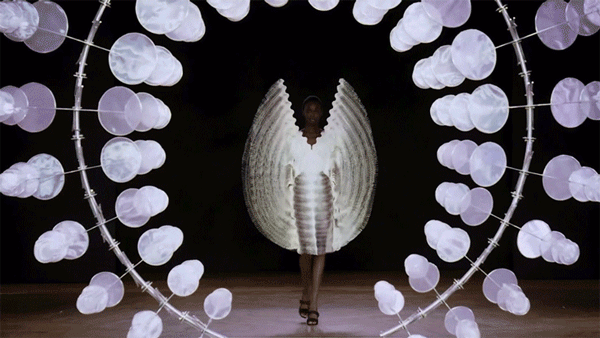 Iris van Herpen,自2007年創立品牌至今,不斷以3D列印技術推進材料革命的她,每一季都仿佛是在為天外來客打造奇幻衣櫥。在她的手下,服裝是有生命的,是流動的,不囿於身體,也不該局限身體。2019秋冬高定系列發布,她邀請美國藝術家Anthony Howe打造了一個模擬月相的巨型裝置作為秀場的背景,隨著月亮的陰晴圓缺,服裝也呈現不同的形態,時而緊緊包裹著身體,時而舒展開來。其中一襲歐根紗裙還邀請到了前NASA工程師Kim Keever進行合作,變化萬千、如夢似幻的色彩鋪滿透明的薄紗,走動間裙擺輕拂,如萬花筒般的星系在眼前流轉。