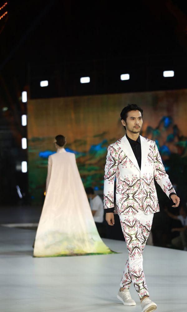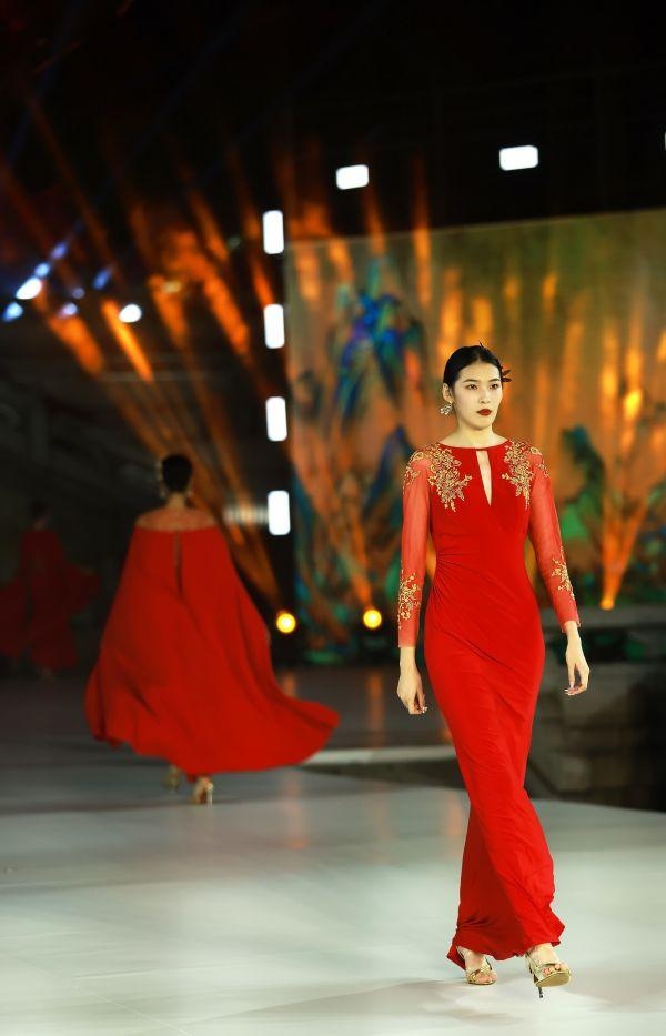 傳統文化劇目表演之外,身穿EVE CINA高級定制禮服的時尚模特們依次登場,以黃鶴樓軒廊、亭閣作為民族時尚的走秀舞臺,在荊楚之地上演繹了一場國潮大秀。他們將布依族、苗族、蒙古族、白族、哈尼族、黎族等30多個民族美學文化集中呈現。一件件精緻又華美的時尚服裝,承載著各民族迥然不同的民族風情,閃爍江城。