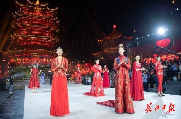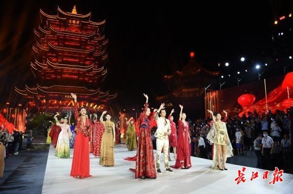 長江日報大武漢客戶端9月30日訊 2021國慶「漢風國潮·禮讚大陸」時尚大秀活動在黃鶴樓舉行。活動現場有「楚劇王子」餘維剛等青年表演藝術家表演楚劇、漢秀三代非遺傳承人開展時空對話、京漢楚劇三名表演藝術家戲曲聯唱。另外還有時裝模特身著定制服裝走秀,將傳統文化與潮流時尚融合,探索城市時尚文化發展之路。