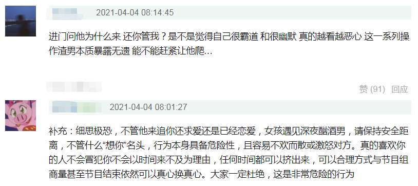 看到李元韜的異常表現後,白冰再次拉開了兩人的距離,而且叫來了在屋內居住的其他人一起,看來當時白冰內心也是非常害怕的。此事一出,節目組當時就已經被網友質疑,完全不顧女嘉賓的安全,而在節目的最後,兩人也沒能走到一起。