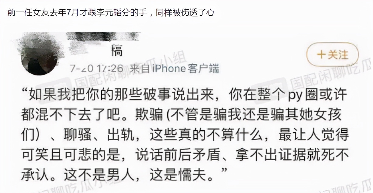但對於他的人品問題,李元韜前妻的朋友就已經爆料過,在婚後一個月婚內就迅速出軌,並且同時李元韜就被其他交往過的女生爆料,早就有了類似出軌、冷暴力、多次交往多位女生的行為。