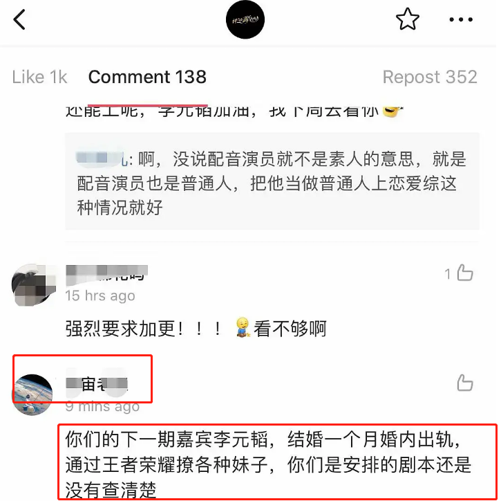在該粉絲把這件事公開後,又有另一女生把曾經和李元韜交往中發現的問題說了出來,並且曬出了相關的聊天記錄,李元韜疑似不僅同時交往多位女性,而且還在婚內出軌。