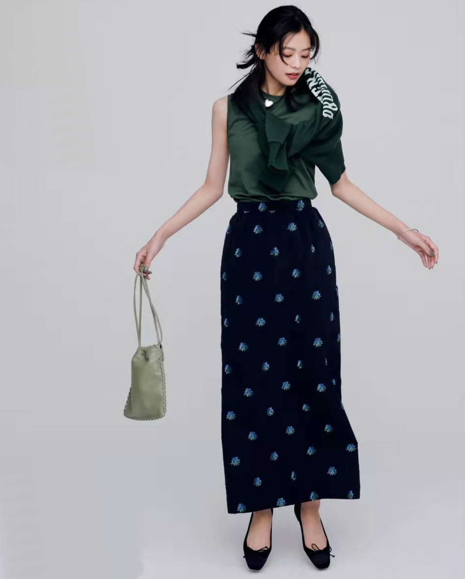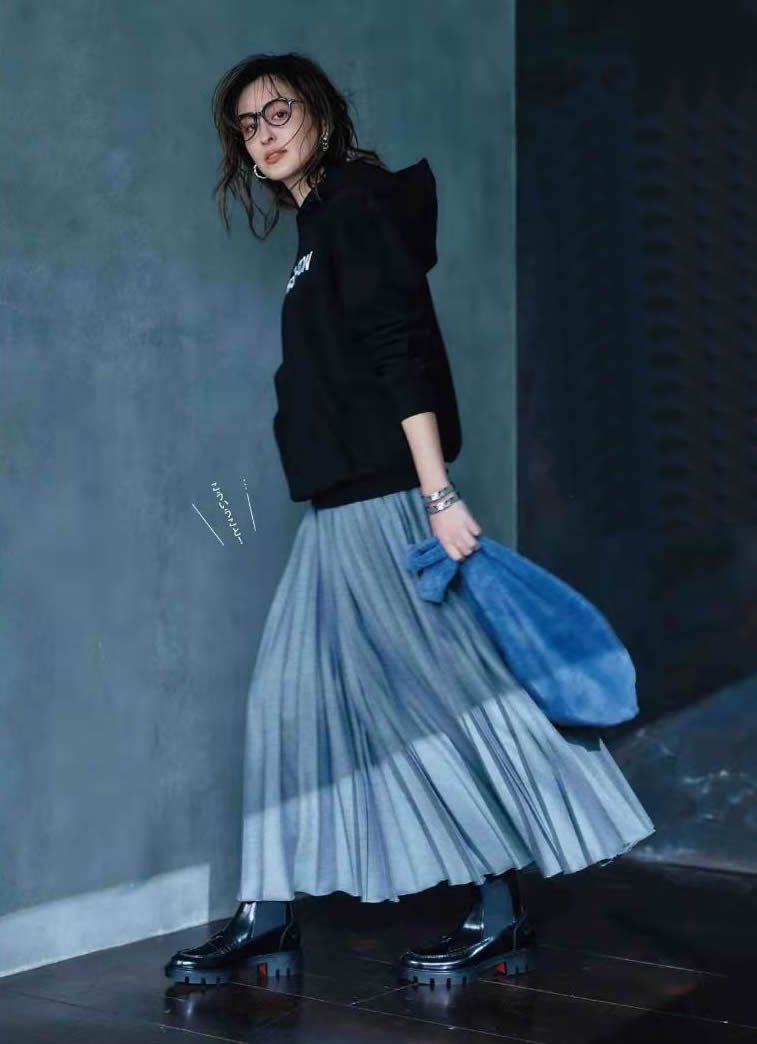 衛衣與半身裙搭配,將一份休閒與一份溫柔,調和得恰到好處。各有特色,互不退讓干擾,自成一派風景。