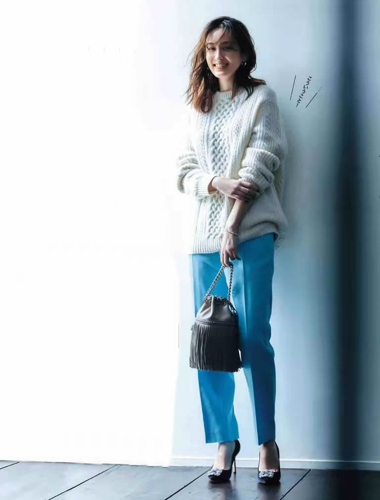 白色柔和毛衣,寬鬆休閒版型,需要【緊致】才和諧。利落的藍色錐形褲,兼具雙重特性,搭配得恰到好處。
