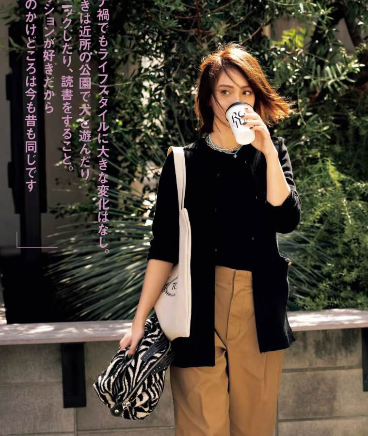 將米色褲子換成黑色,化身沉穩深色調。與優雅米想比,黑色的大氣磅礴更有氣勢。能看出這套搭配的亮點嗎?