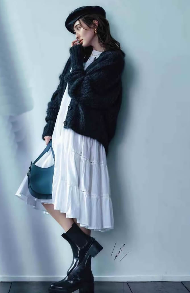 不管怎樣,突出的單品風格也能將普通的針織衫挽救於時髦。一條白色娃娃裙的可愛甜美,化解著沉穩黑色開衫的沉默。