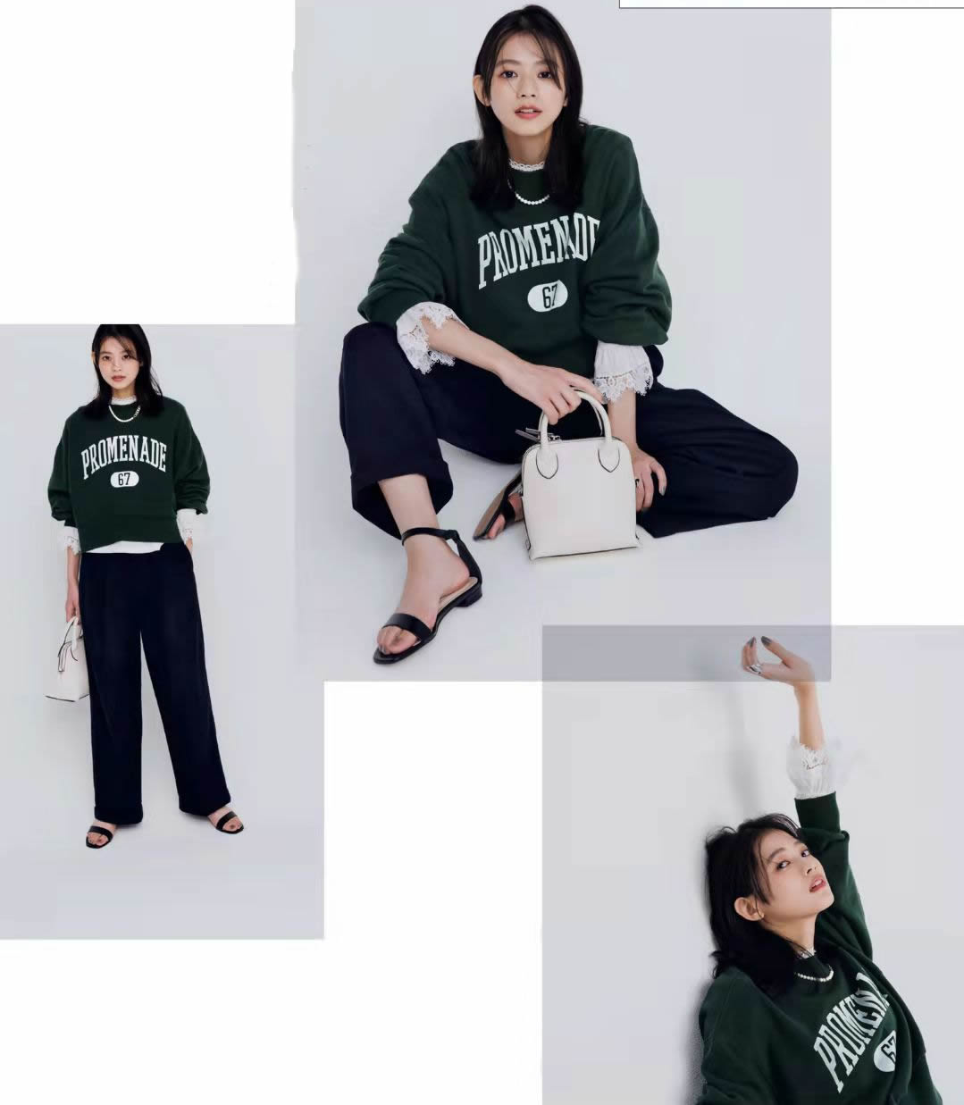 墨綠色+白色,正常搭配會有兩種思路:深色調和淺色調。選擇與白色呼應的米白色,從內搭到褲子,乃至疊穿的針織衫,全部保持一致。