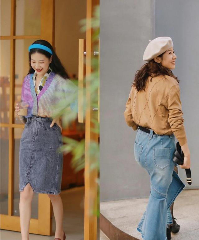 以這款牛仔半裙為例,它因為面料彈性少了一些,更容易包裹住曲線,但如果你本身身體線條不那麼好看,就要換成過膝的傘裙。