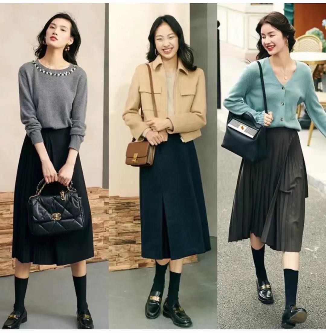藏青色的半身裙顯得女生膚色更加白淨了,而且裙擺呈現小小的A字形,也在悄悄地修飾著女生的腿型,讓女生的腿型看起來更加筆直。