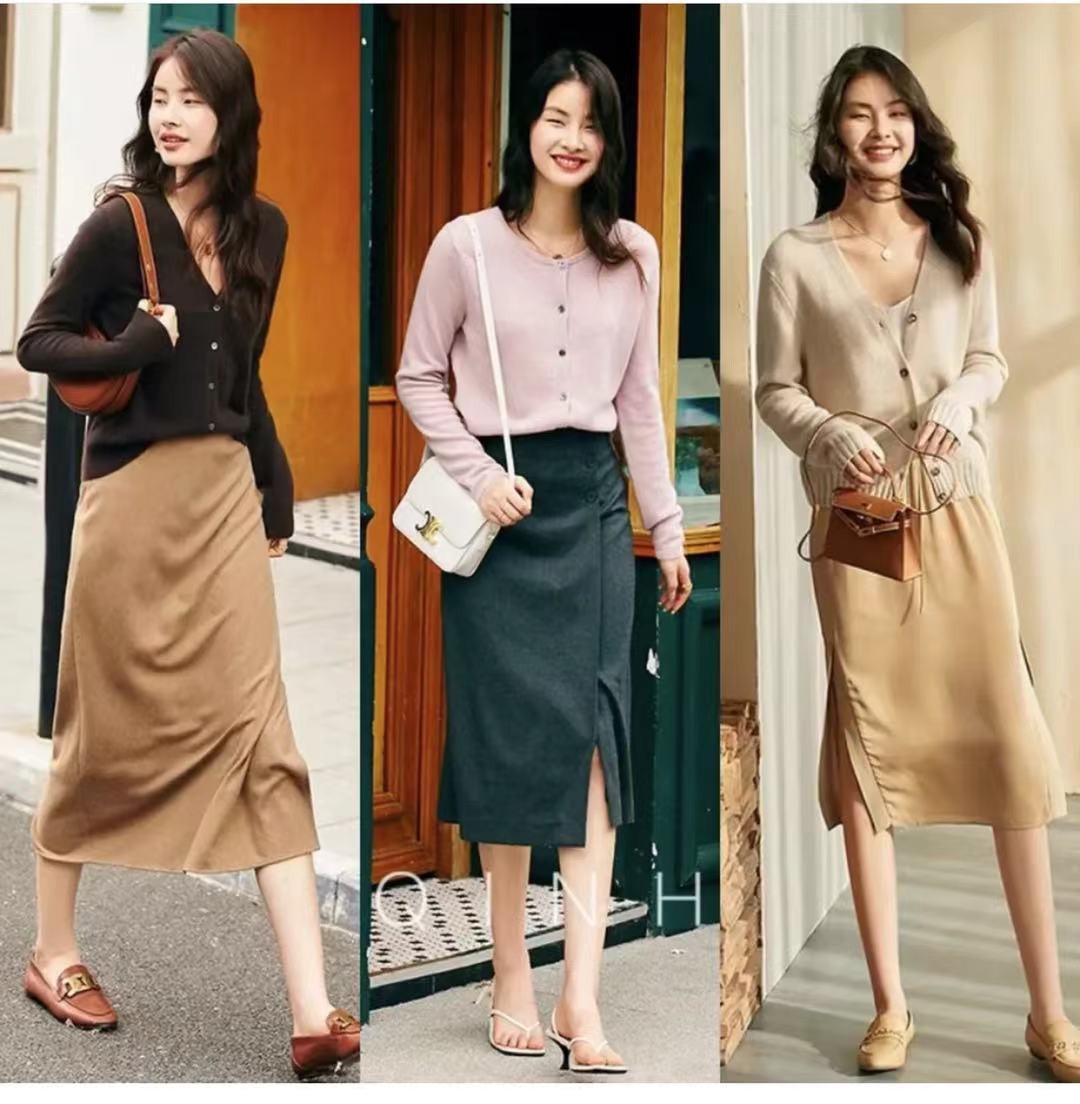 秋季的半身裙穿搭種類和類型好似要比連衣裙更為多一些,女生也可以根據自己的喜好和習慣進行搭配,深灰色的半身裙褲腳處做了小開叉,精緻也顯腿部線條,也是獨出機杼的性感。