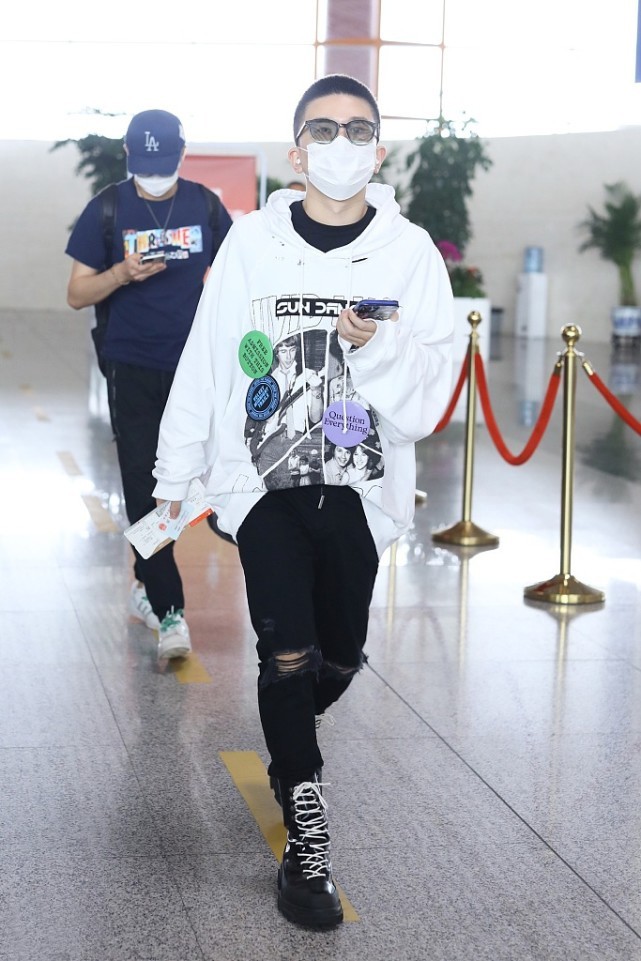 不過,在選擇黑白配色時,最好要配合極簡設計來打造時髦造型。張大大選擇的白色印花衛衣配合破洞褲雖然也是黑白配色,但看起來會有些混亂,高幫馬丁靴的加入讓元素更顯繁多,反而不利於呈現出清爽帥氣感。