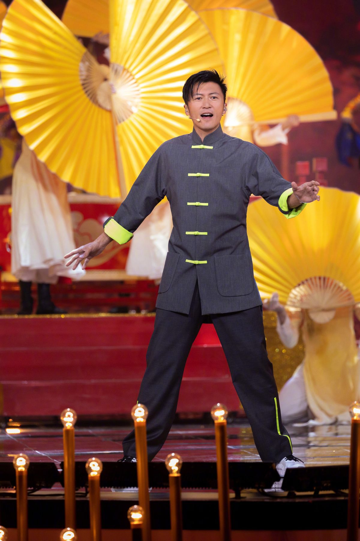 謝霆鋒的穿搭之中就融入了較多的國風元素,唐裝元素標誌性的直筒衣身配合熒光色盤扣設計,看起來簡約大方而又不失時髦。在深灰色基調的襯托下,熒光色衣袖與紐扣的設計看起來尤為亮眼,也讓唐裝元素的風格看起來更加多元新穎。