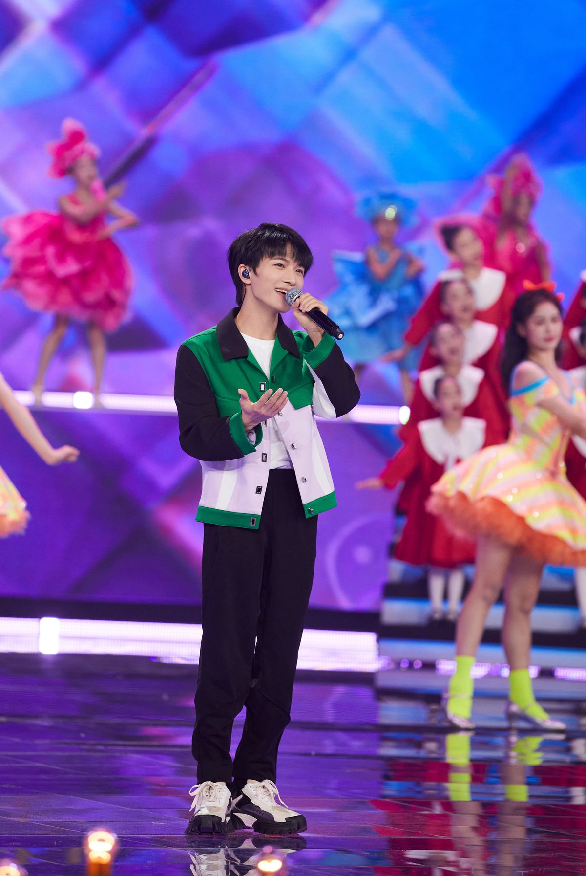 周深就選擇了潮流感十足的撞色搭配呈現時尚效果,直筒版型的短外套恰好能夠修飾他的身材,潮流幹練又不會顯矮,配合綠、白與黑的撞色組合更添潮酷。