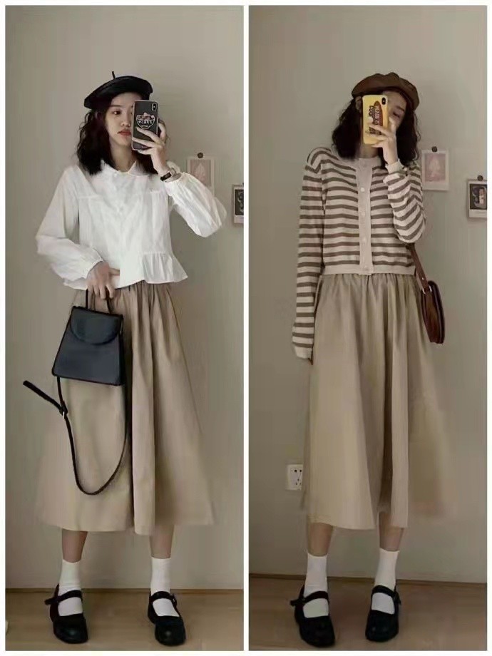 條紋款式的單品,搭配卡其色的半身裙,同樣是有著濃濃秋日氣氛的顏色,打造出清新的感覺。