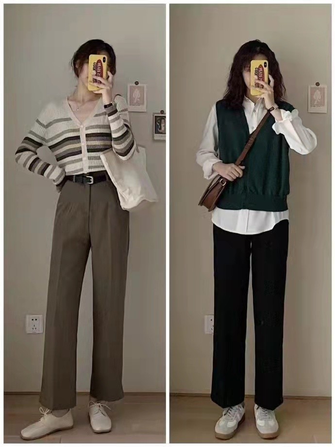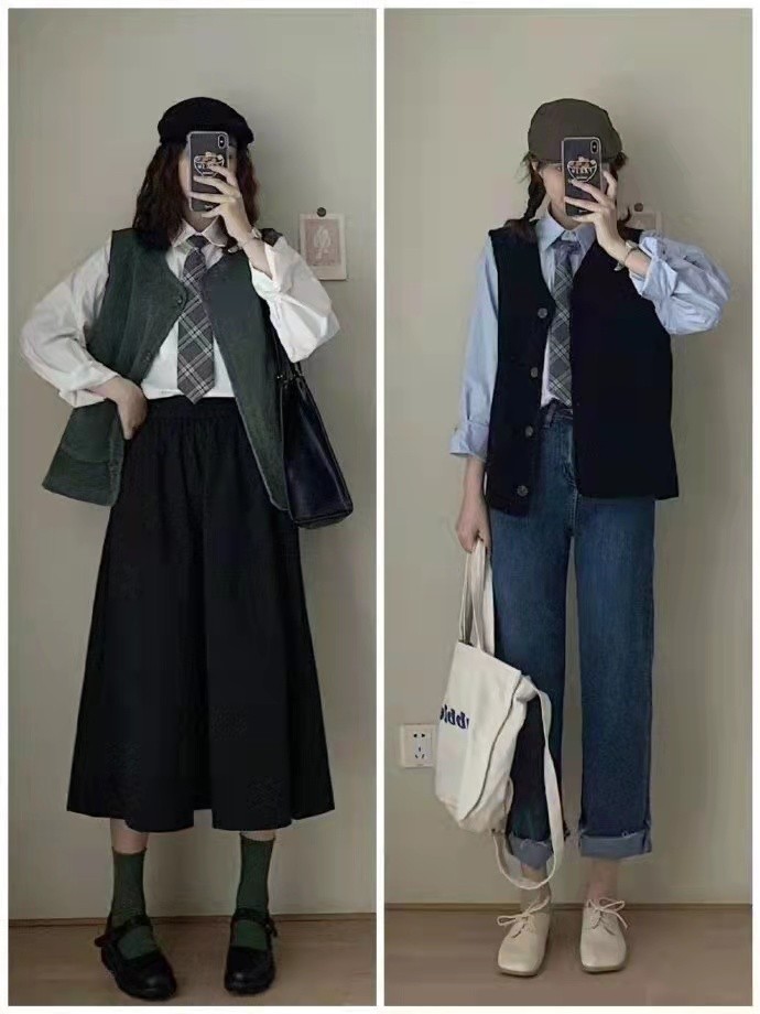 中規中矩的襯衫搭配馬甲,就會有進一步的層次提升。搭配裙子高級優雅,搭配褲子更加的帥氣利落!