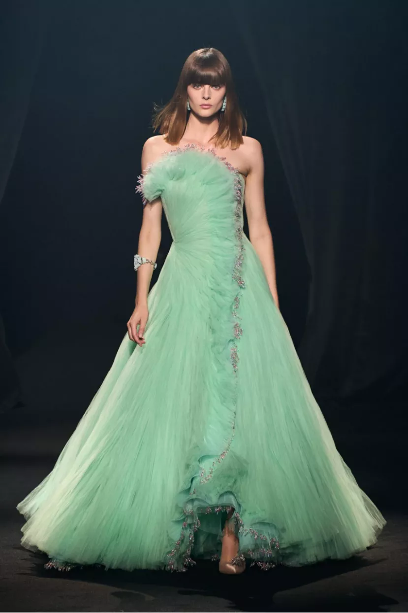 Armani老爺子設計的玉石綠禮服中,運用了Alber鐘愛的荷葉邊。