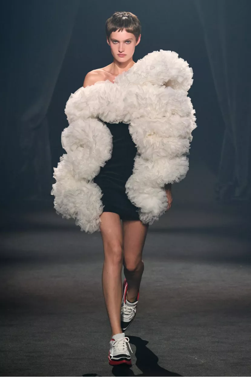 ALEXANDER MCQUEEN 的黑色小禮服兩側運用了超大荷葉邊,這也是Alber設計的特色。