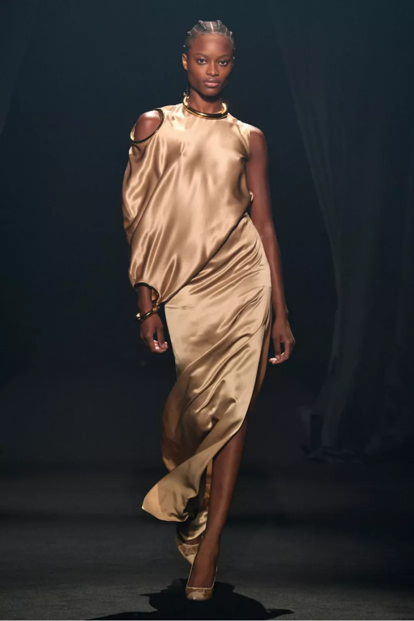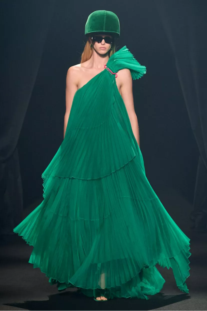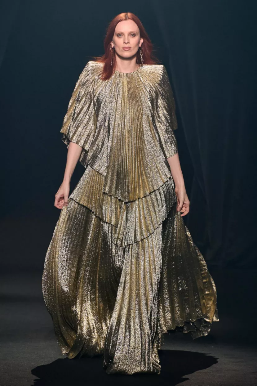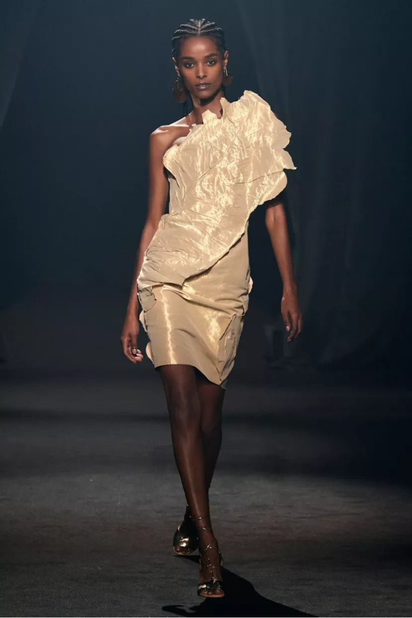Kim Jones打造了一條香檳金色的雞尾酒裙,大面積褶皺設計也是Alber昔日愛用的風格。