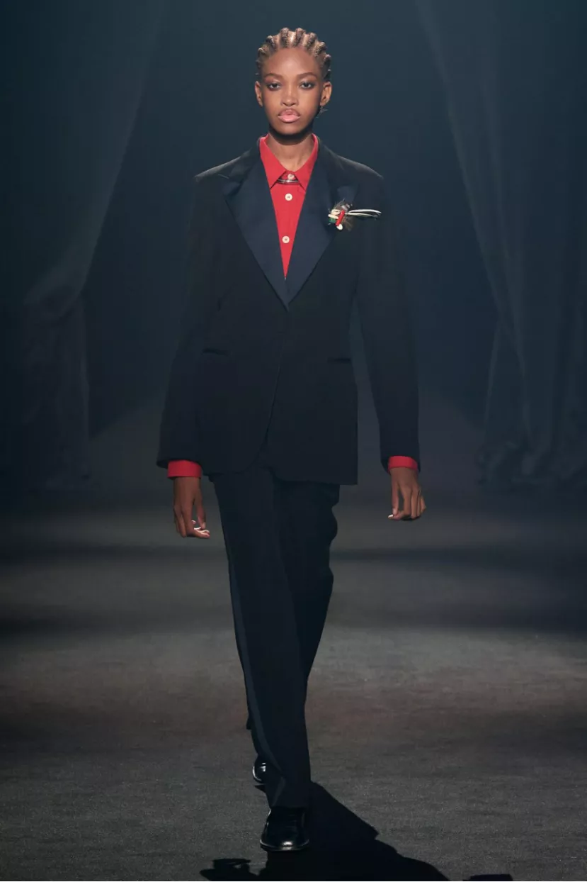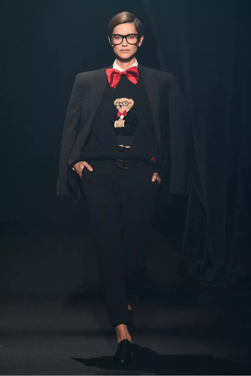 Ralph Lauren效仿Alber最愛的黑色西裝+領結,讓他的模特以及她毛衣正面的Polo Bear上都換上相似造型。