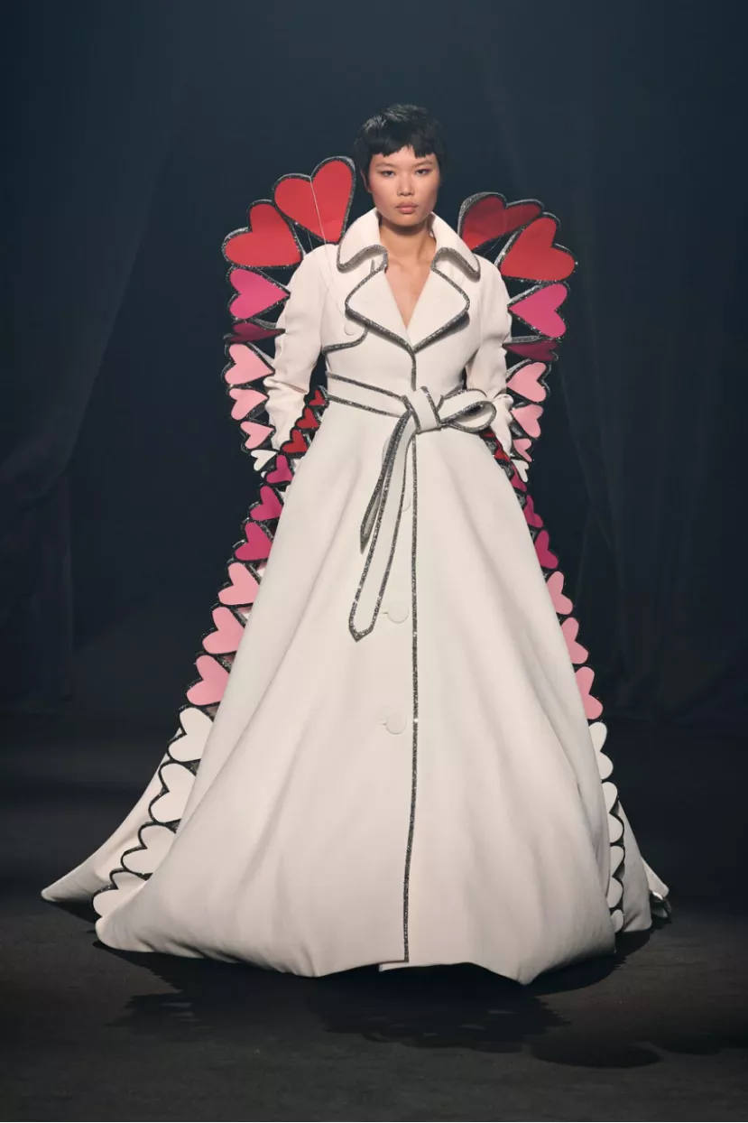 Viktor & Rolf的白色風衣舞會禮服威嚴又正式,袖子和裙子點綴著漸變的心形,又給造型融入了絲絲俏皮。