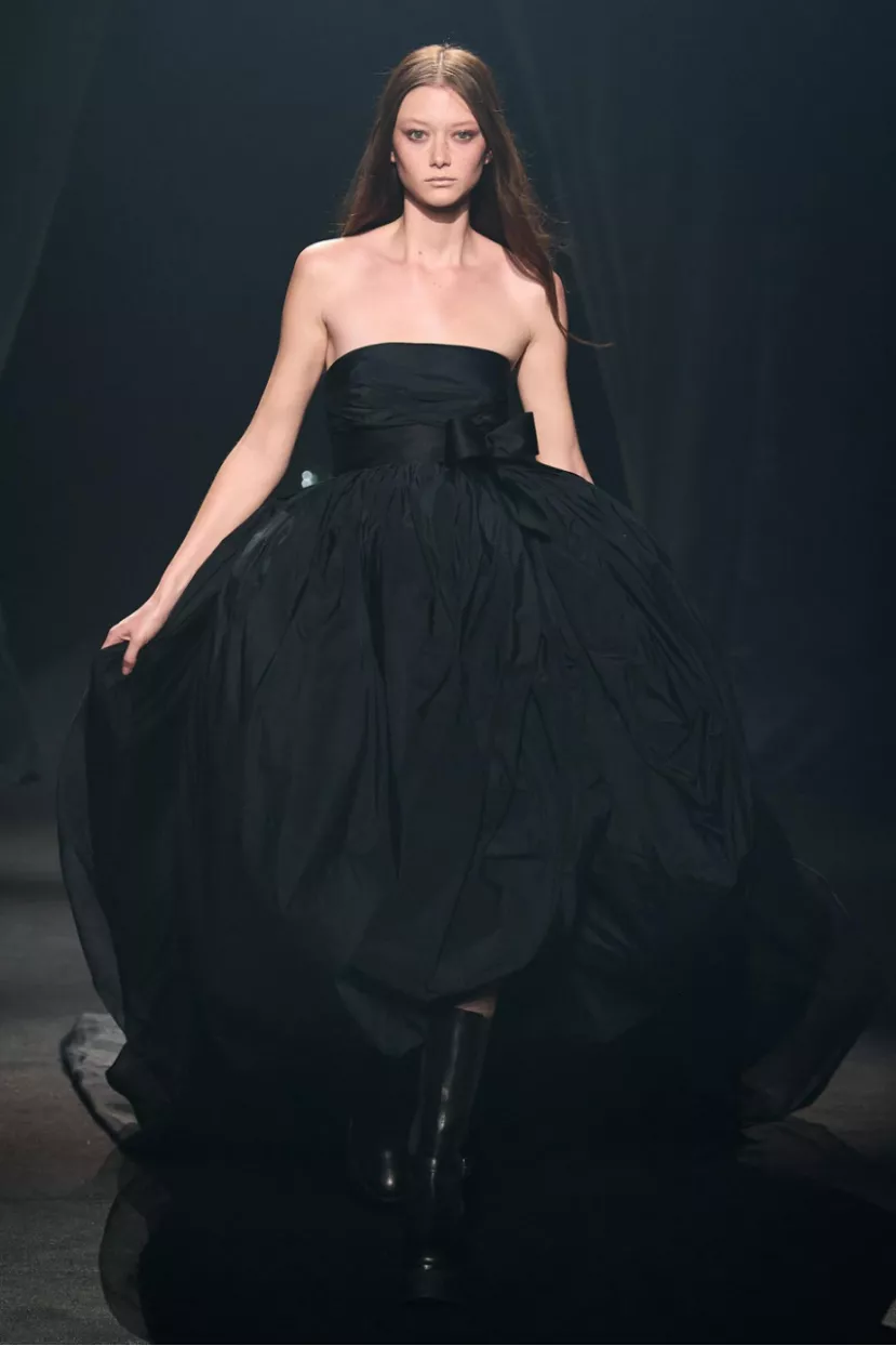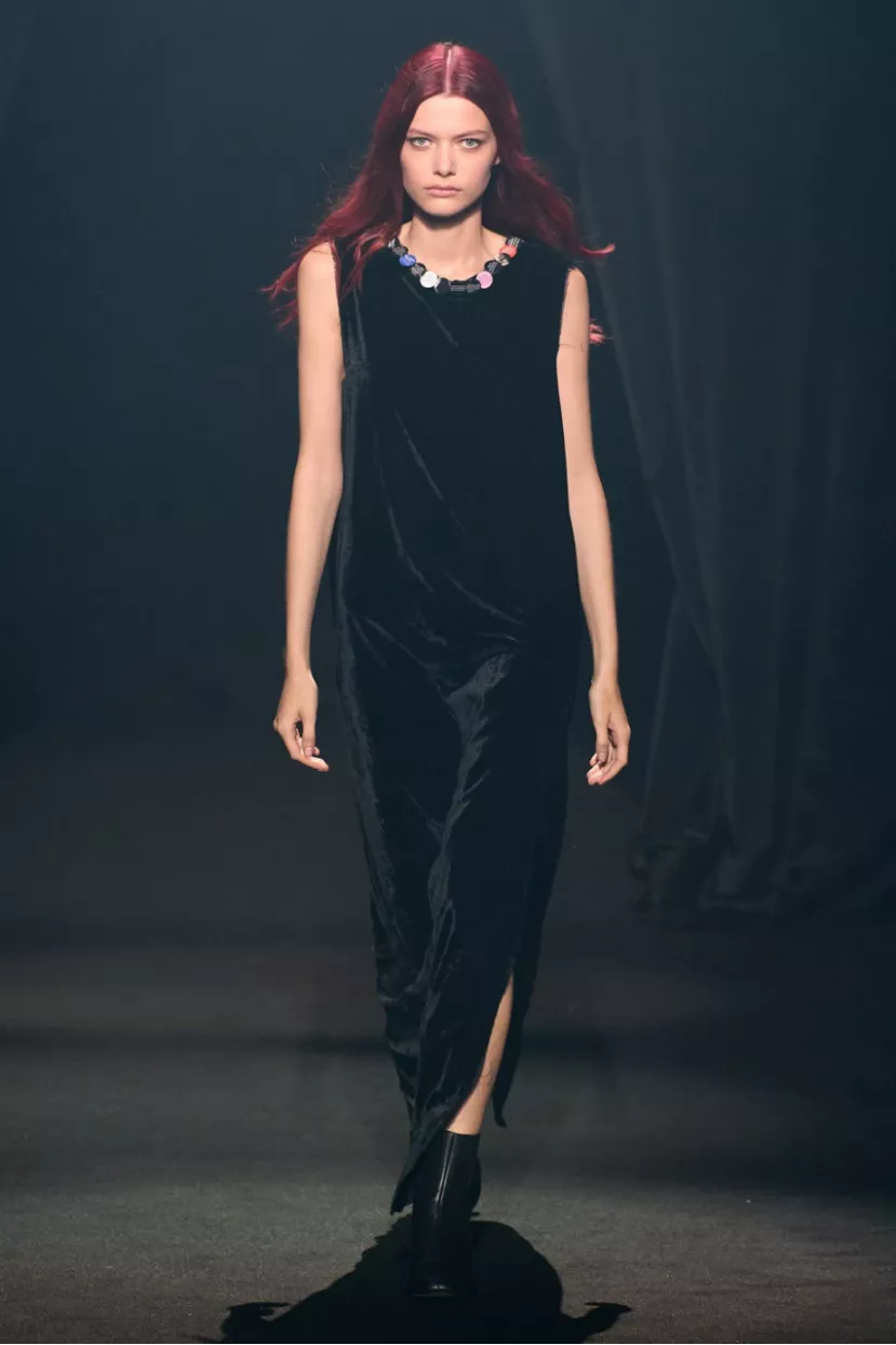 昏暗的光影下,由Alber Elbaz自己設計的AZ Factory黑色連衣裙第一個登場,不規則的袖子造型很有Alber不拘一格的特色,讓穿衣者充分享受造型的樂趣。