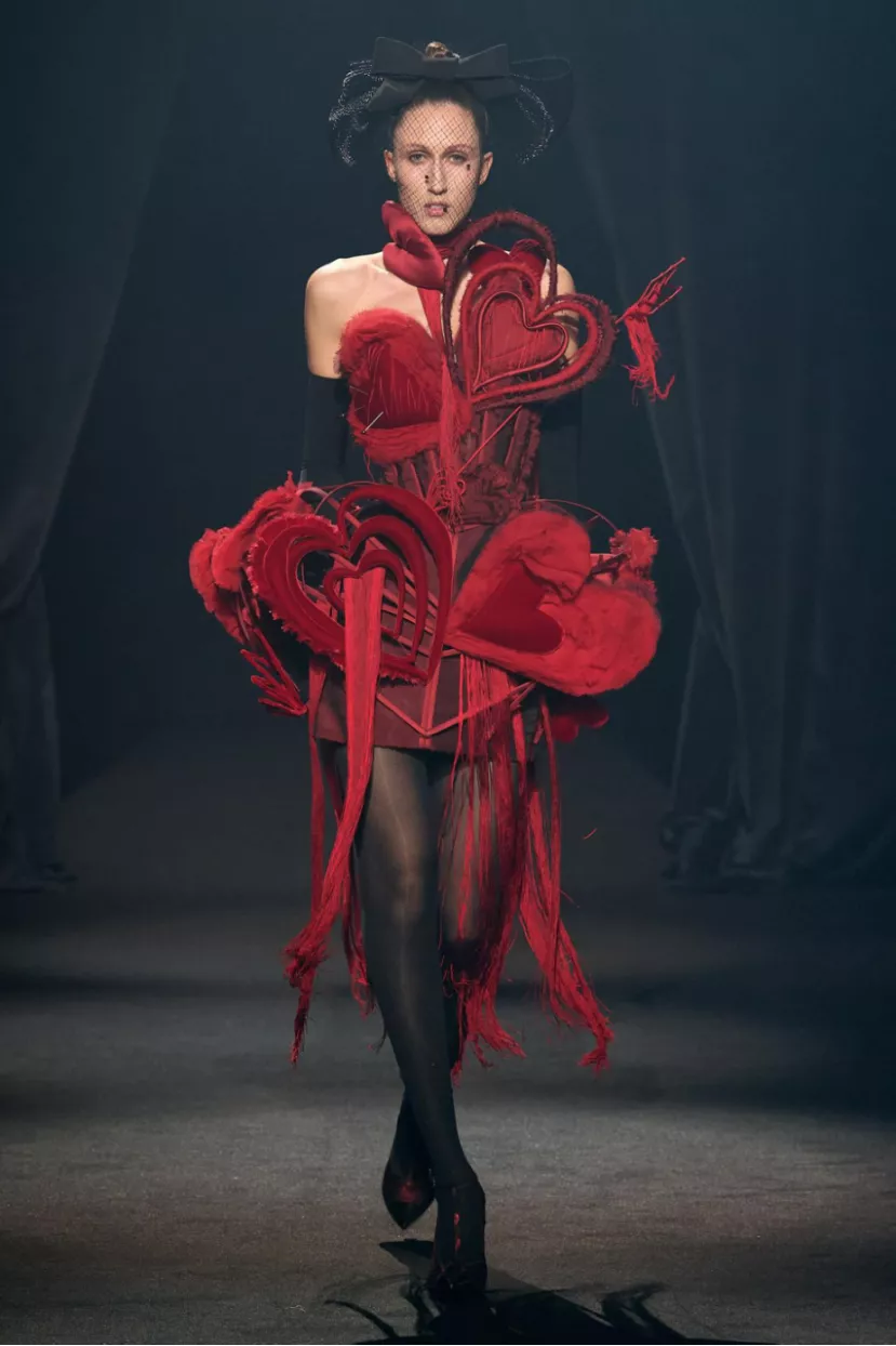 Jean-Paul Gaultier引用Alber的「coeur a l’ouvrage」,帶來一件立體且層次感分明的紅心高級禮服。