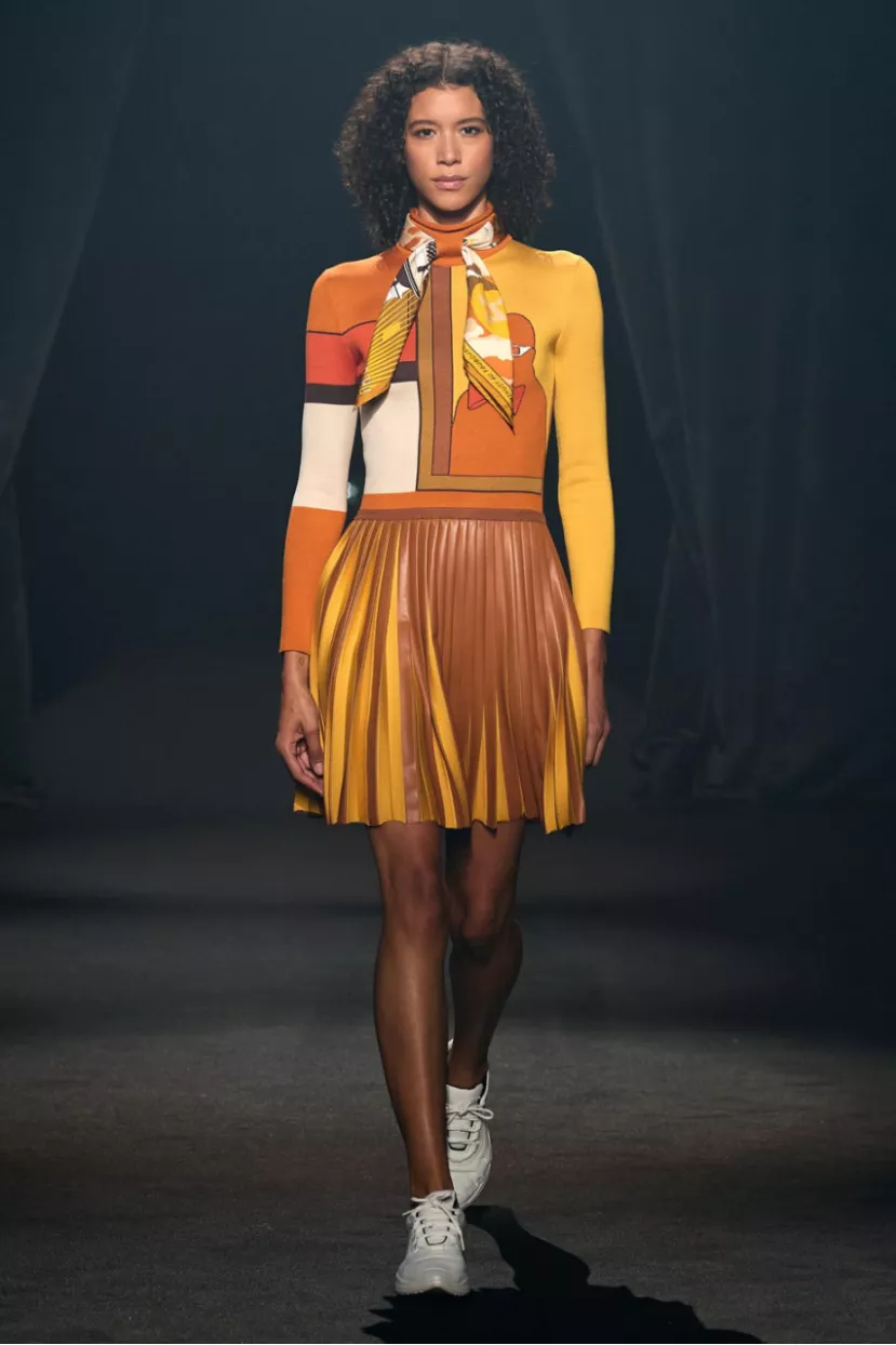 Nadège Vanhée-Cybulski 帶來的這件針織皮革裙裝非常有Hermès的味道,衣襟處則參考了Alber喜歡的蝴蝶結。