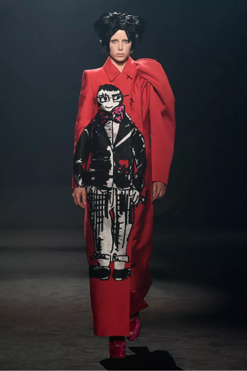 Dries Van Noten把Alber的自畫像印在鮮紅色外套的一側,另一側用了Alber曾在Lanvin雞尾酒裙上使用過的羊腿袖。