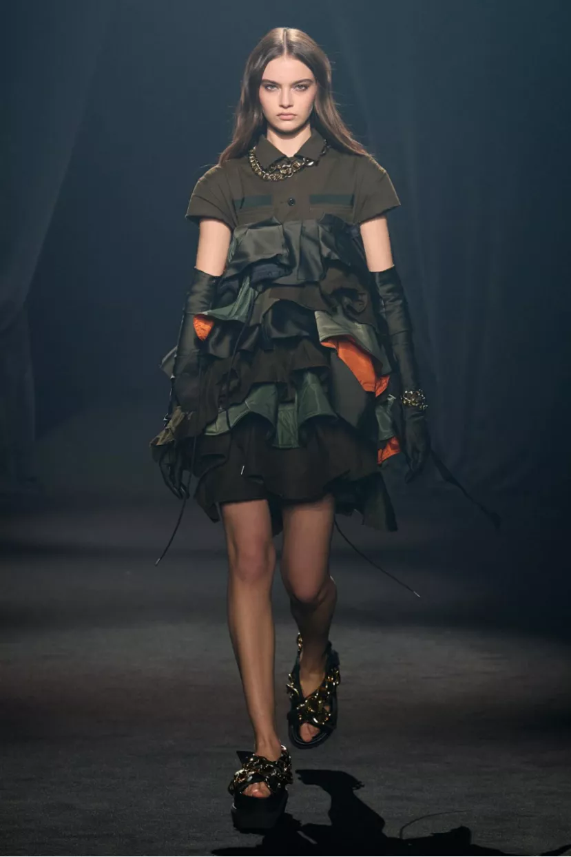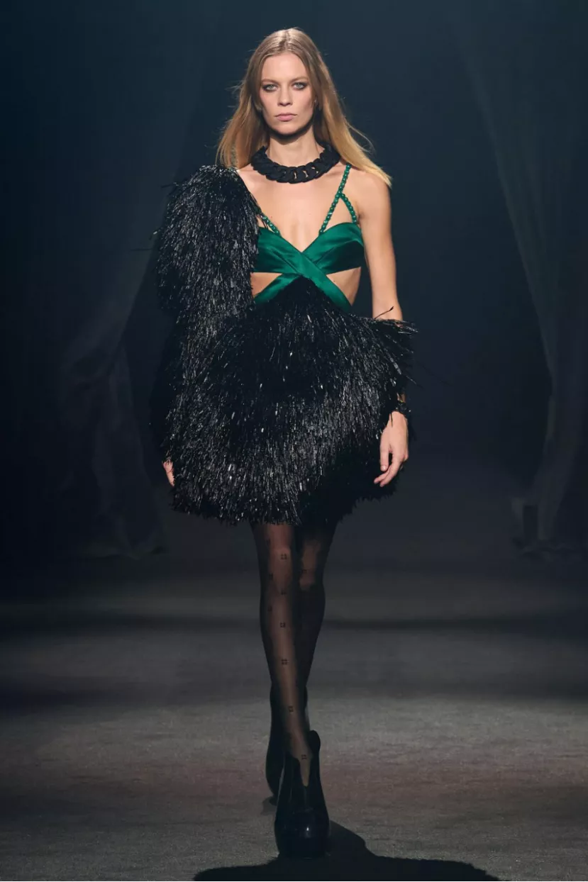 時下最火的BV綠也被Daniel Lee運用到裙子上,串珠致敬的是Lanvin 2007春夏系列的黑色雞尾酒裙。