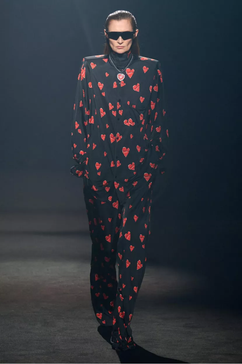 VETEMENTS的寬肩套裝上散落著翻滾的心形印花