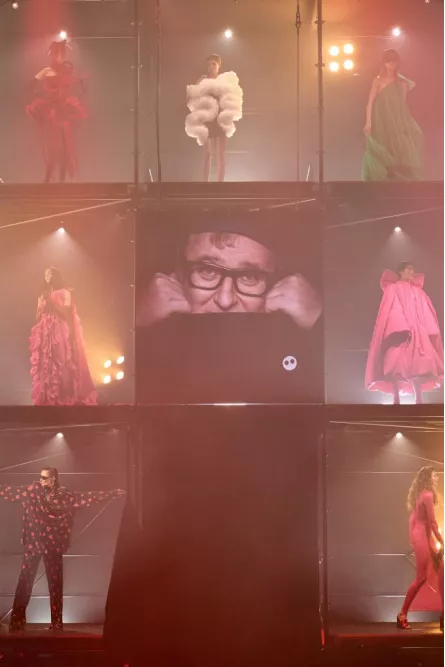 在時裝秀的最後,幕布拉開,模特們在三層高的腳手架網格中顯露出來,勾勒出 Elbaz 的肖像,心形五彩紙屑紛至沓來,觀眾們的眼淚也忍不住湧出。