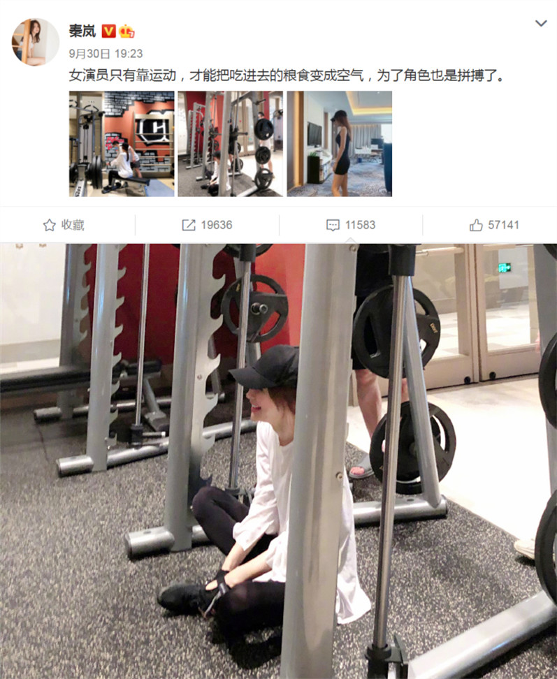 日前,秦嵐發了一條運動健身的微博的,並配字「女演員只有靠運動,才能把吃進去的糧食變成空氣,為了角色也是拼搏了。」,言為之意,身為女演員的她要邁開腿,管住嘴,為了角色努力瘦身。