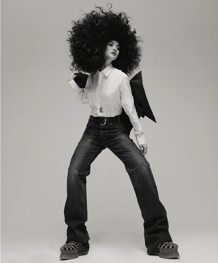 說到對於復古元素的印象,首先可能會想到喇叭褲,其次可能會想到爆炸頭,這兩個都是非常具有代表性的。所以如果想要比較有誇張個性的風格,復古感也要非常濃鬱的話,可以選擇這套搭配。