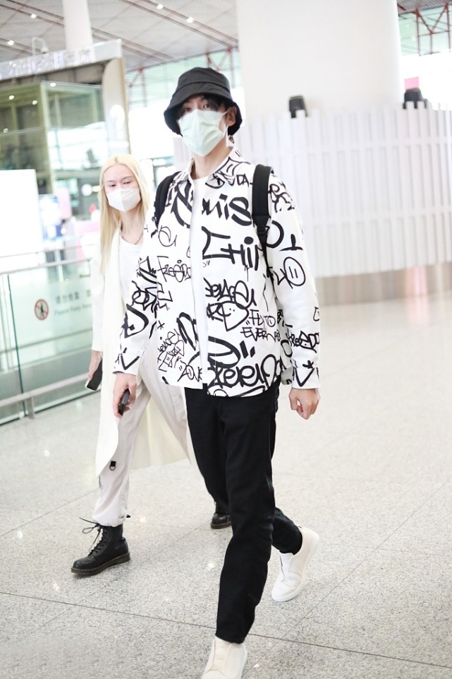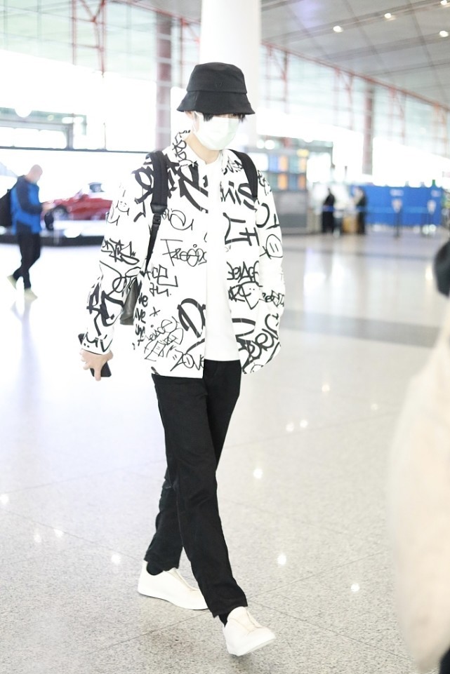 張雲龍就選擇了一件帶有繁雜印花設計的襯衫來打造時髦造型,白色襯衫的基礎上加入凌亂的黑色塗鴉裝飾,使整個人看起來青春潮流感大增,整個人都活力十足。