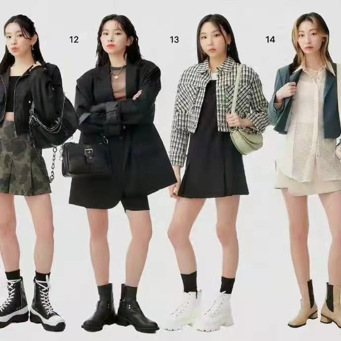 除了長靴之外,就是各種類型的短靴,到達腳踝處的短靴搭配短裙,或者是形成下半身失蹤的方式,大面積的露腿,打造了韓國女團的氣質。