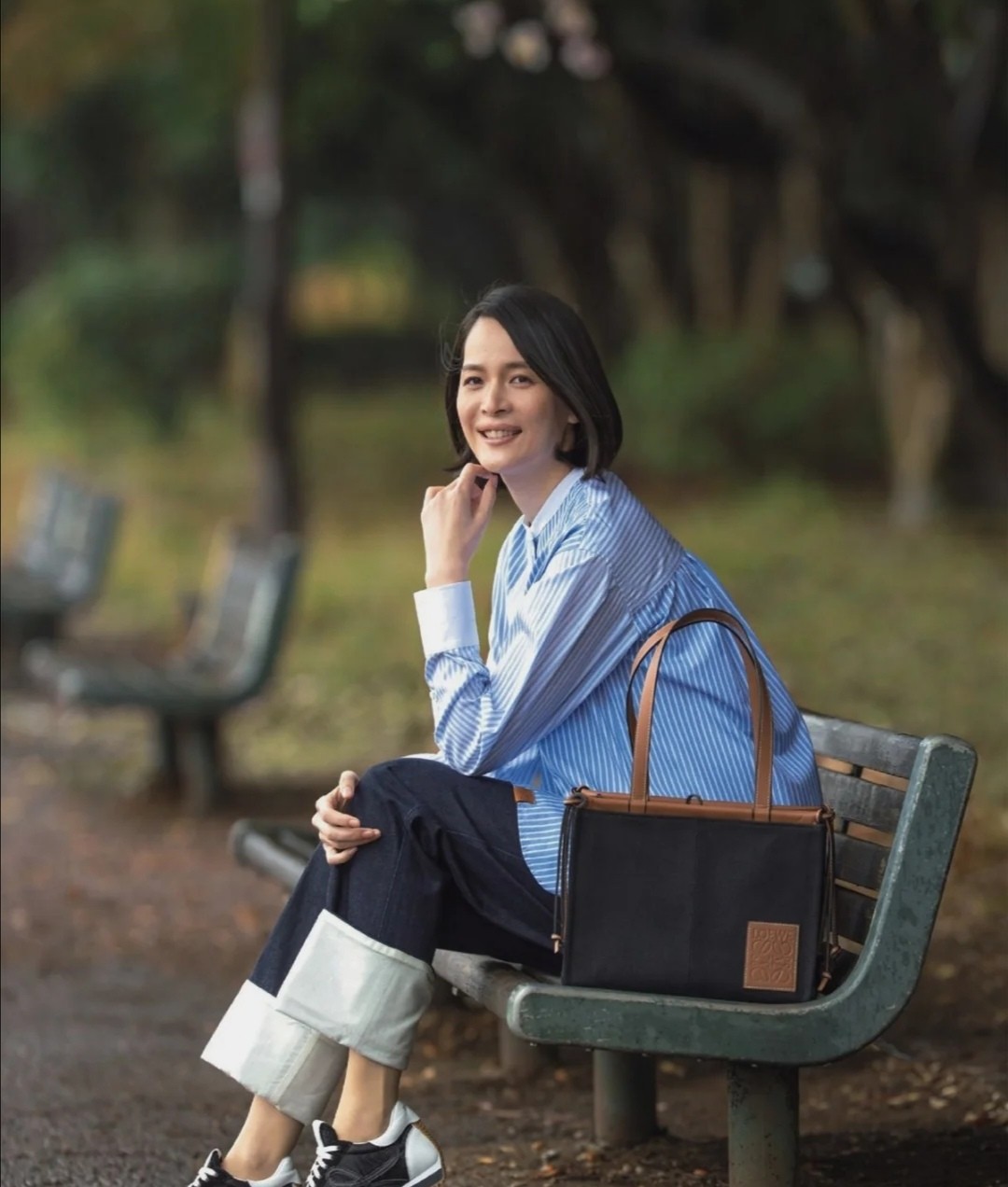 這款豎條紋的襯衫,顏色的疊加不多,以兩種色彩為主,構成了清新的畫面。配一款牛仔褲,更是集合了滿滿的減齡元素,讓女性的穿搭直接脫離老土的范疇。