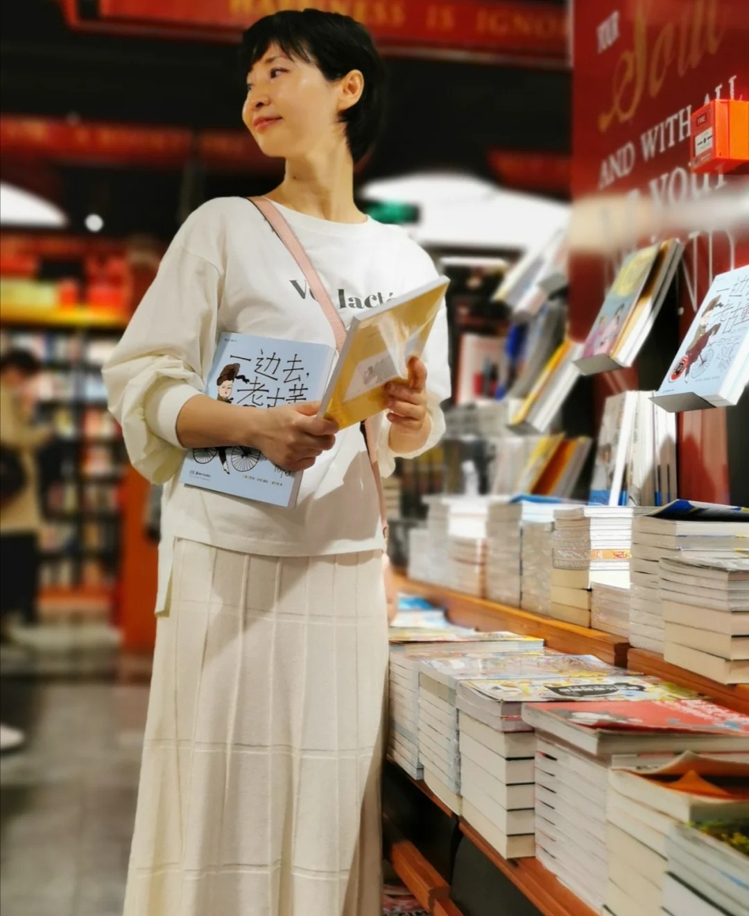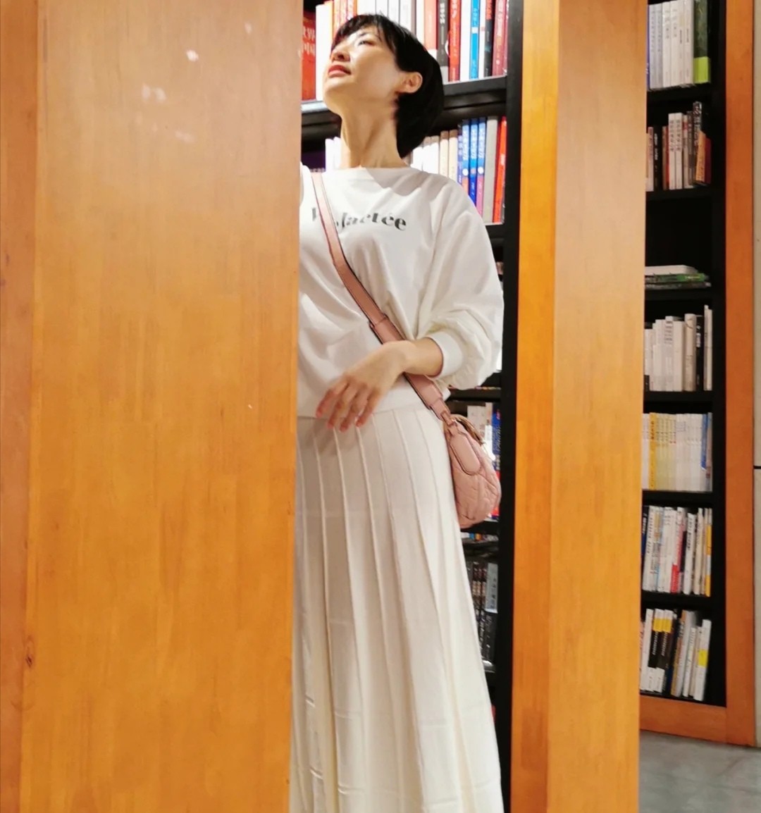 圓形領口的白色衛衣,其實對女性的年齡有著相當明顯的弱化作用,外形的塑造,不需要加以大面積的圖案或者是卡通的點綴,就能讓它呈現出一種純粹的簡約的美感。五十多歲的女性,要是覺得自己的大腿贅肉很多,可以巧妙地尋求半身裙的幫助。