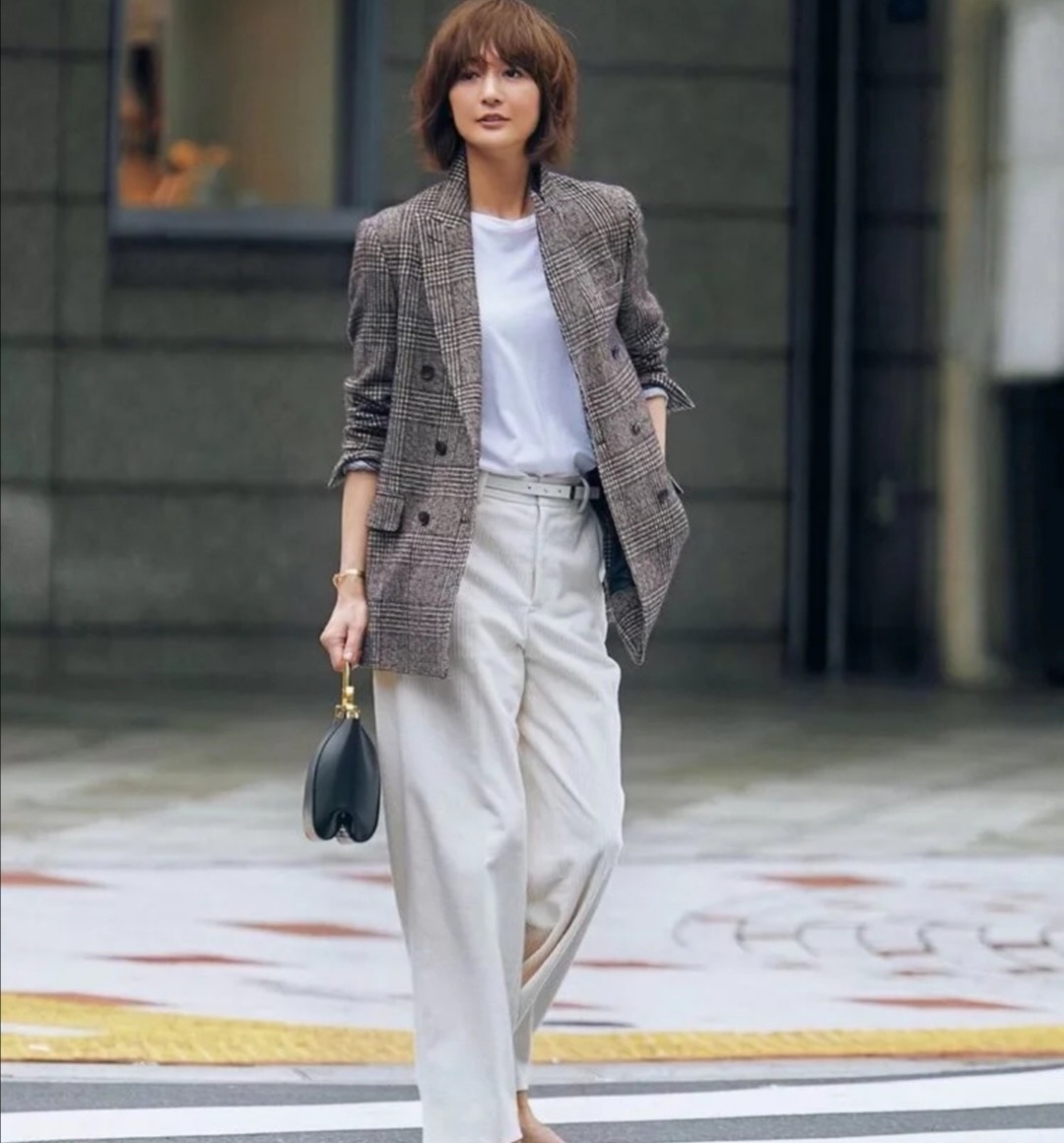 五十來歲的女性在挑選西裝時,可以運用一些簡單色彩拼接的樣式,例如黑色、灰色等,減少這類色彩暗沉氣質的方案其實特別簡單,也相當快捷。運用各種色調的白色內搭與長褲的配合,總能夠形成簡約而又清爽的畫面。