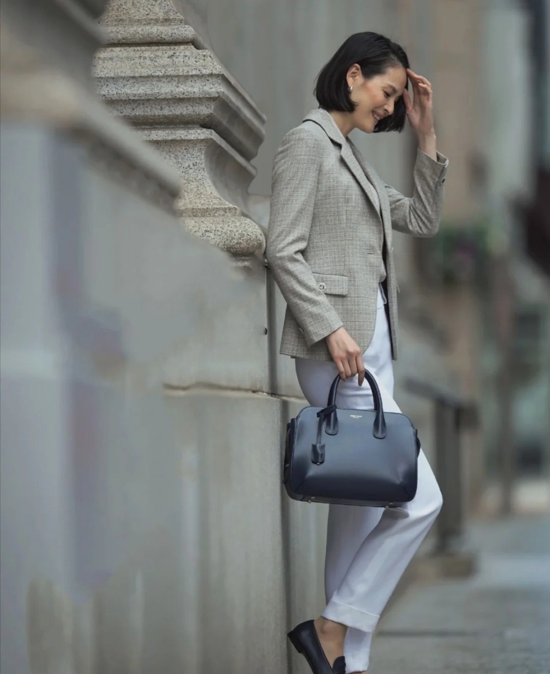 像這一款西裝穿搭就會更加正式一點,而且顏色的排列很有大氣感,灰色的外套與白色褲裝的協調十分完美,既不會顯得太膚淺,又不會看起來暗淡,可以幫助女性正式得體的一面盡情的展現出來。