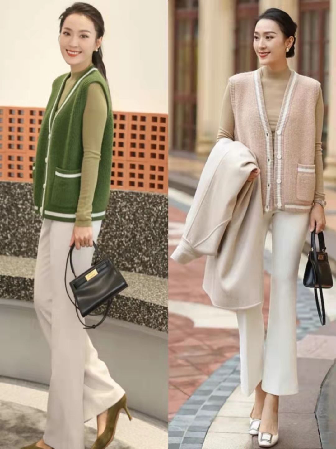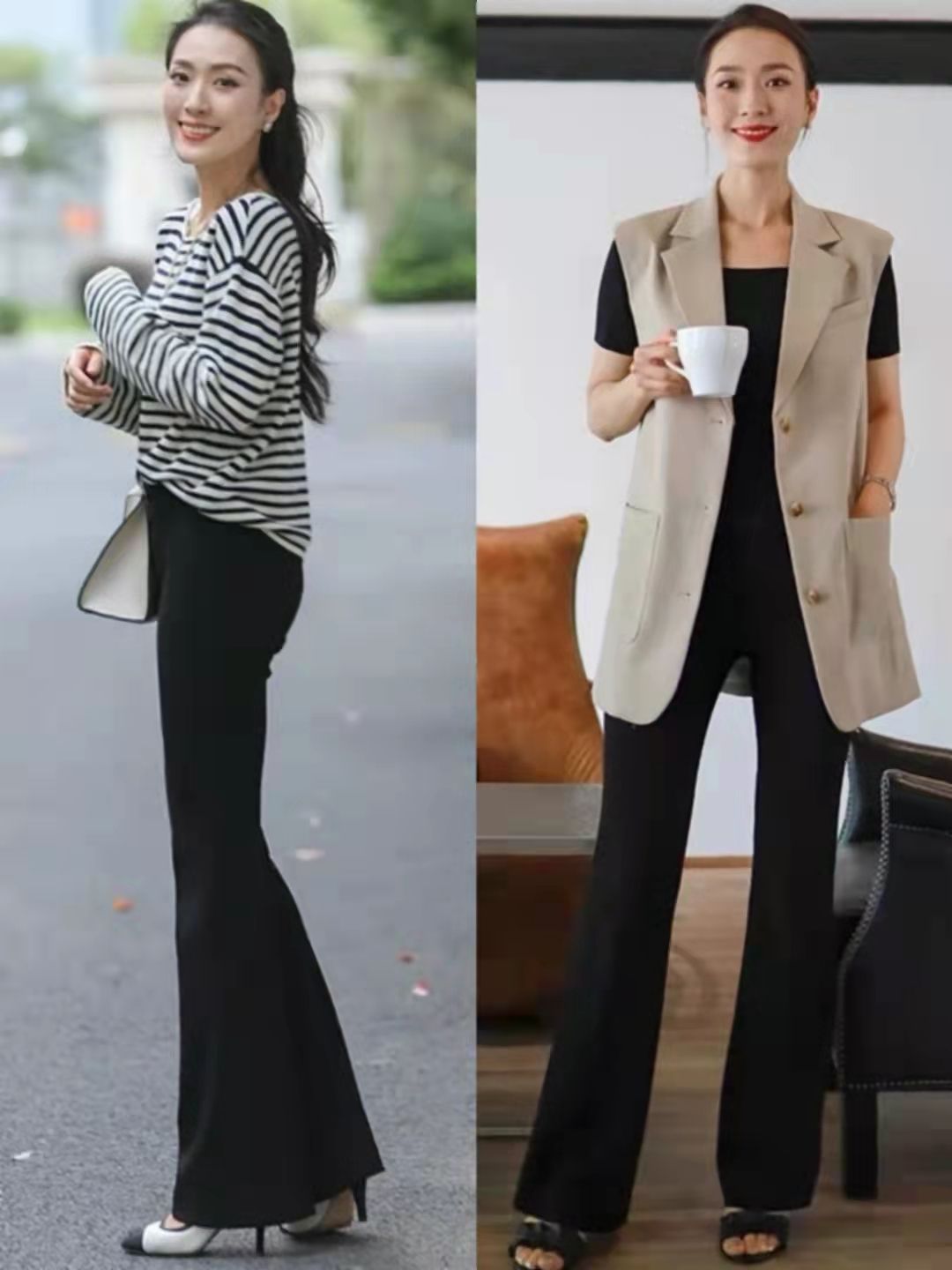 秋季是疊穿的主場,用呢子馬甲或者針織馬甲疊穿打底衫時,整體穿衣重心會得到上移,這時搭條喇叭長褲,則能進一步發揮出中年女生的好身材。