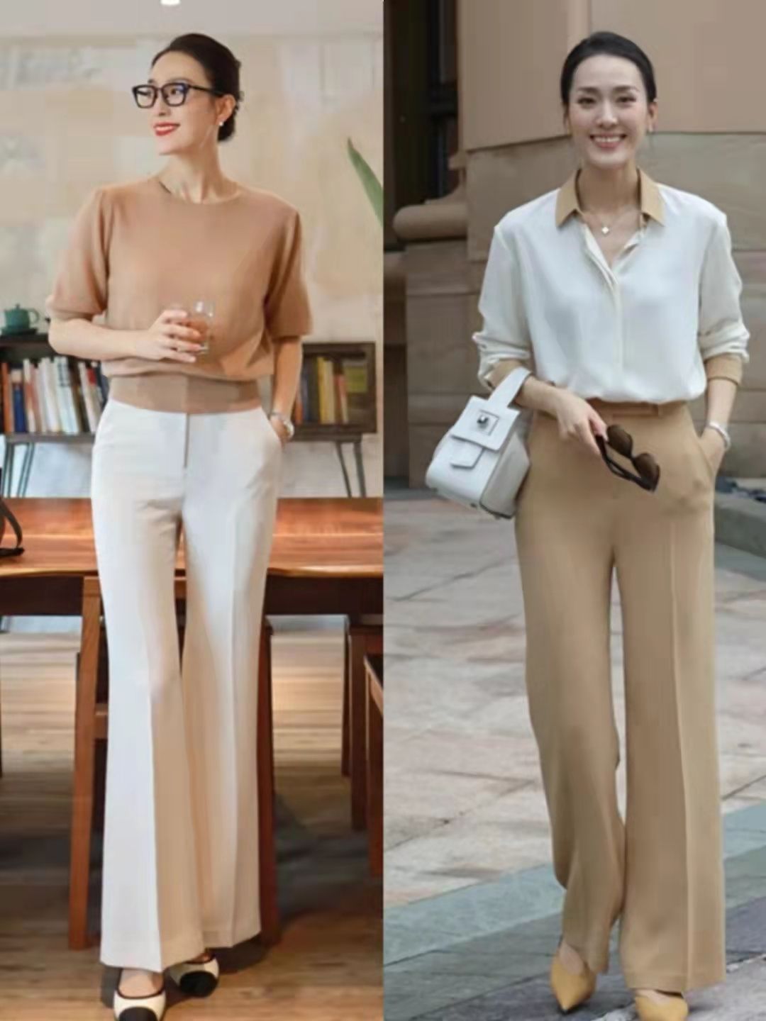 色彩運用是穿搭中的重要組成部分,用針織衫、襯衫或者其他秋季外套組合喇叭褲時,中年女生需要優先採用基礎色、大地色系,以及將全身顏色控制在三種及其以下。