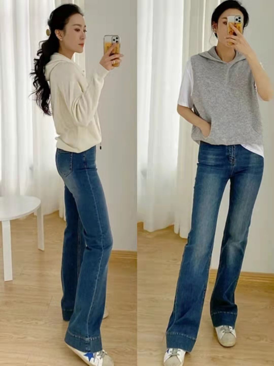 除了組合衛衣、馬甲外,各種秋季外套也是喇叭褲的好搭檔,如針織開衫、過腰西裝、過腰風衣或者大衣。