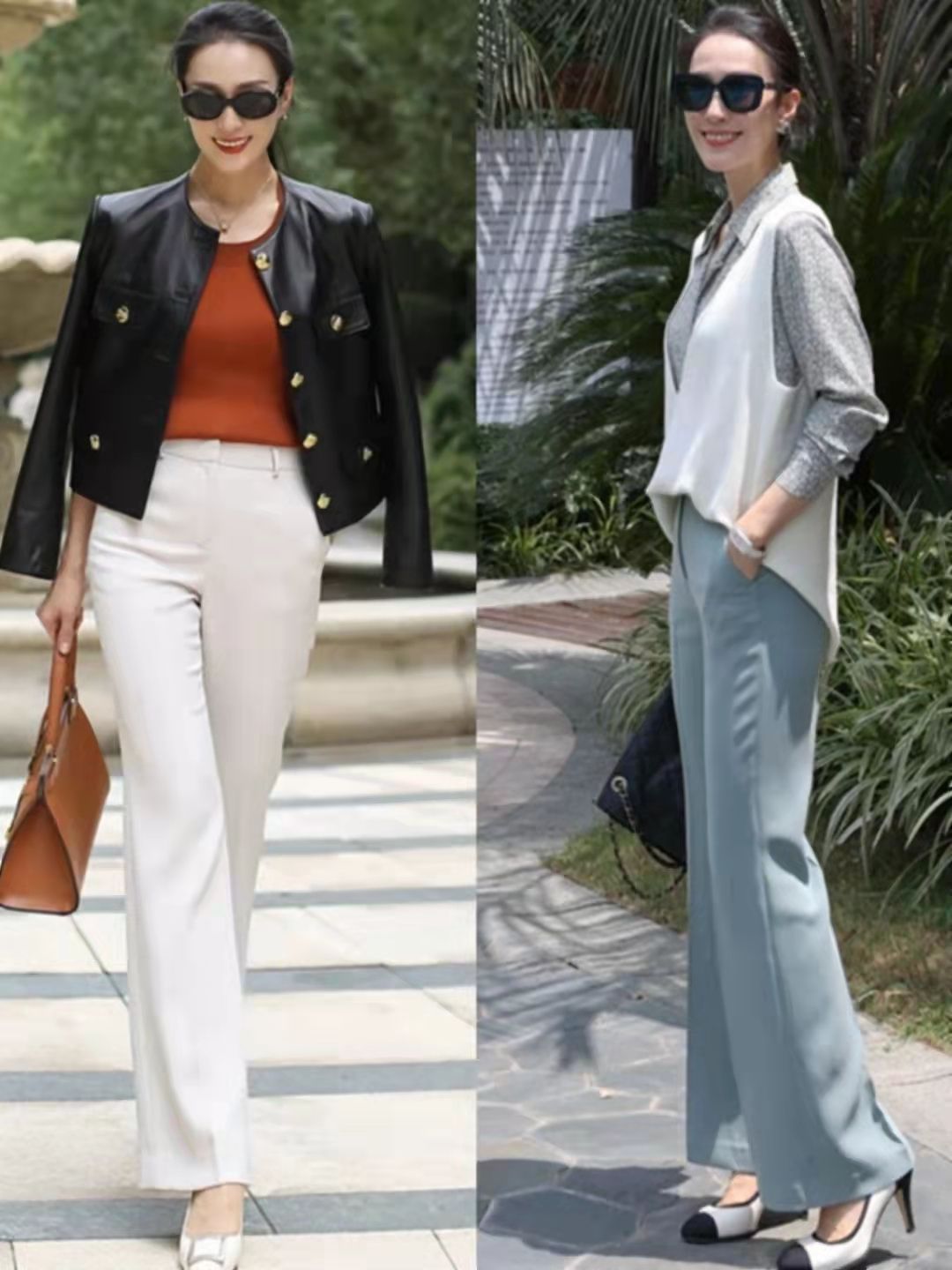 中年女生要想將喇叭褲穿出走路帶風的效果,那麼褲裝材質越垂墜平整越好,像由西裝材質制成的喇叭拖地褲,便是職場女生的最佳選擇。