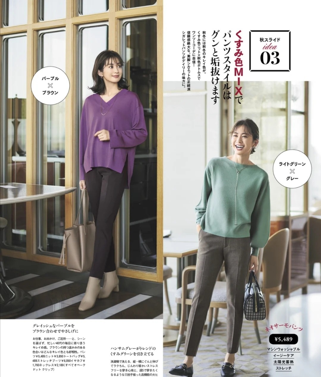 像這兩款褲裝,還保留了九分褲的裁剪,如果想要突出腳踝的纖細,可以配合樂福鞋,但如果擔心這樣搭會寒冷,就可以搭配一款小短靴。