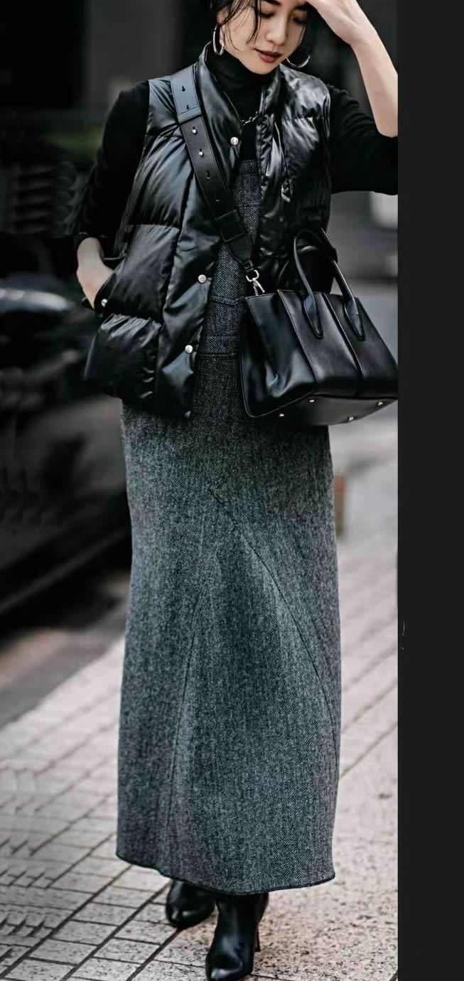 內搭黑色毛衣和灰色背帶長裙,原本是乖巧的優雅模樣,全因流光溢彩的亮面而炫酷時髦。細節方面,個性大耳飾與斜背包造勢,與流行接軌的高級非同凡響。