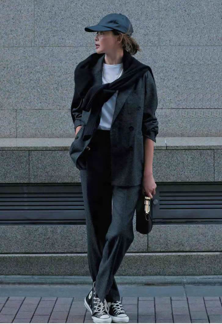要點:黑色針織衫的肩頭疊穿,無疑強化著休閒意味。而一頂棒球帽的隨意戴,弱化套裝的正式感。細節調和,從來都不是白費功夫。