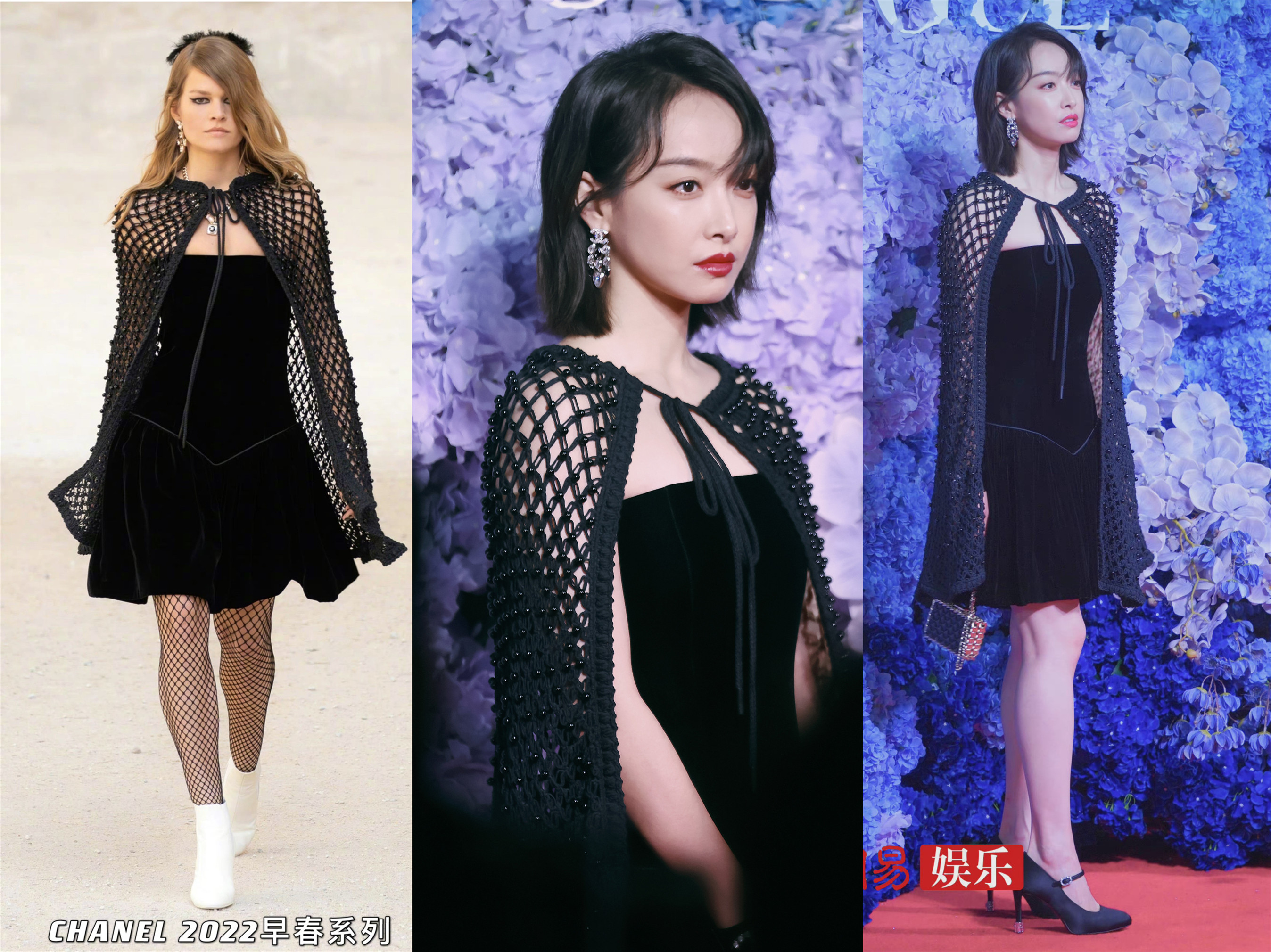 宋茜選了一套ChannelCHANEL 2022 Resort 小黑裙,小黑裙是經典不出錯的紅毯選擇,但是為了增加造型的亮點,這套黑裙外面加了一件漁網的披肩,秀場模特的搭配風格很頹廢,宋茜做了些減法和適當的加法,讓這套香更具有香該有的貴氣和精緻~
